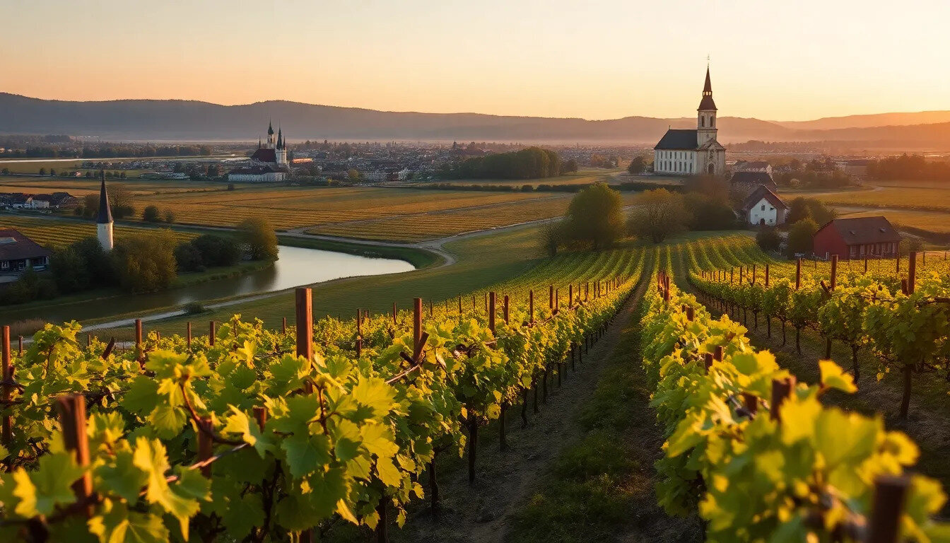 La région viticole de Franken, située en Allemagne, est connue pour ses paysages pittoresques et ses traditions viticoles séculaires. Elle est caractérisée par des collines ondulantes et des rivières, offrant un environnement idéal pour la culture de la vigne. Les vins de Franken, souvent en bouteilles de forme distinctive appelées 'Bocksbeutel', sont principalement élaborés à partir de cépages blancs.