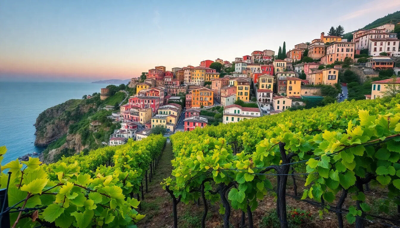 La Ligurie est une région viticole située sur la côte nord-ouest de l'Italie, célèbre pour ses paysages côtiers spectaculaires et ses collines escarpées. La région bénéficie d'un climat méditerranéen, propice à la culture de la vigne, avec des influences maritimes qui modèrent les températures. Les vignobles de Ligurie sont souvent plantés en terrasses, ce qui permet d'optimiser l'exposition au soleil et la drainage des sols.